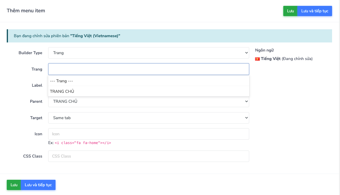 Khi tạo menu item, ta có thể thấy mục Builder Type có các giá trị: link, trang, danh mục bài viết. Và có thể chọn chính xác trang nào hay danh mục nào.